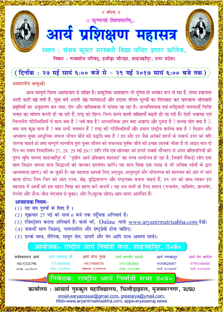 27-28-29 मई 2017, आर्य प्रशिक्षण महासत्र, शाहजहांपुर,उ.प्र